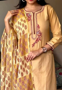 this handloom cotton kurta pant and malmal printed Dupatta set. It comes with handloom cotton straight cut kurta with resham thread embroidery team it with high ankle pants with Style this set with jhumkas and mule heels to complete the look .