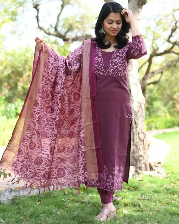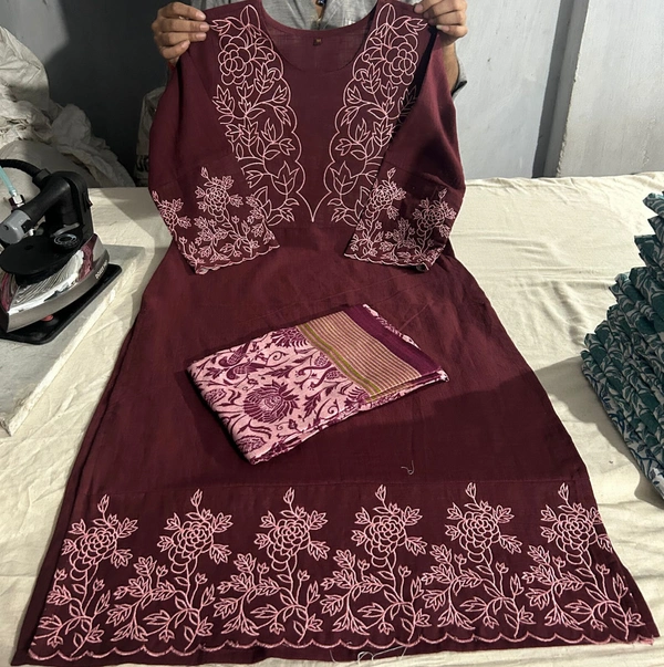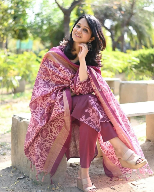 Makes an enticing appearance at traditional events by wearing this handloom cotton kurta pant and khadi silk Dupatta set. It comes with handloom flex straight cut kurta with resham thread embroidery team it with high ankle pants. Style this set with jhumkas and mule heels to complete the look .