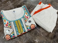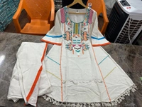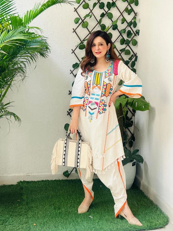*New in festive embroidery work kurta dhoti set. Get your hands on our beautiful off-white kurti with intricate thread embroidery work less work mirror work detailing in bright tone perfect for any auspicious occasion.*