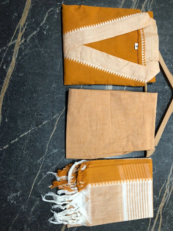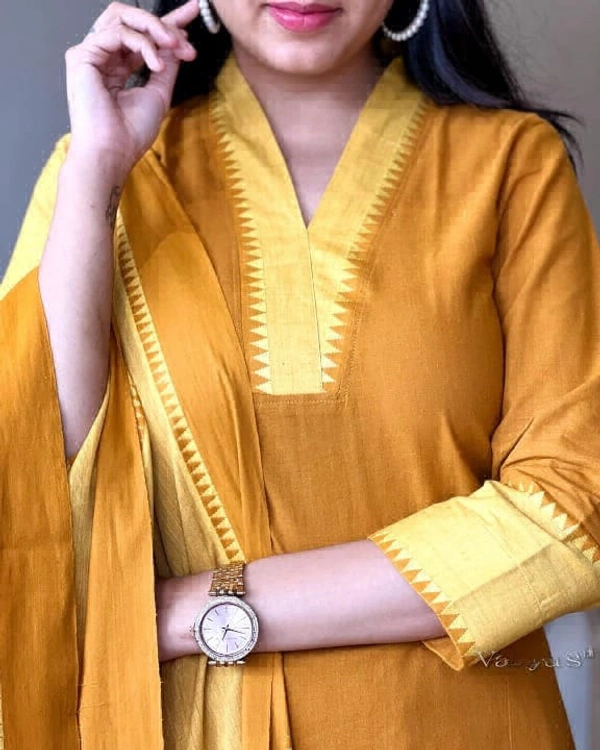 You will be so much in love with this south handloom outfit for combinations of temple border self thread handloom butti south cotton kurta and south cotton pant paired with south cotton duppata self thread self weaving temple border add a unique vibe.