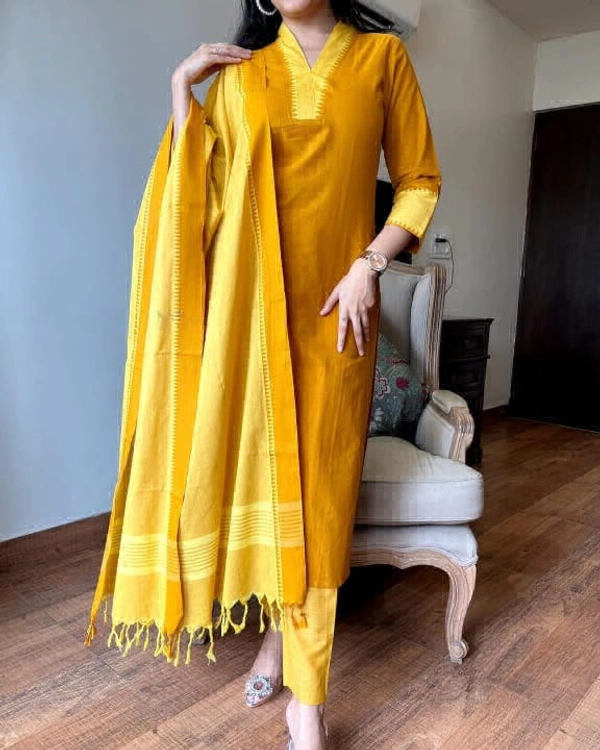 You will be so much in love with this south handloom outfit for combinations of temple border self thread handloom butti south cotton kurta and south cotton pant paired with south cotton duppata self thread self weaving temple border add a unique vibe.