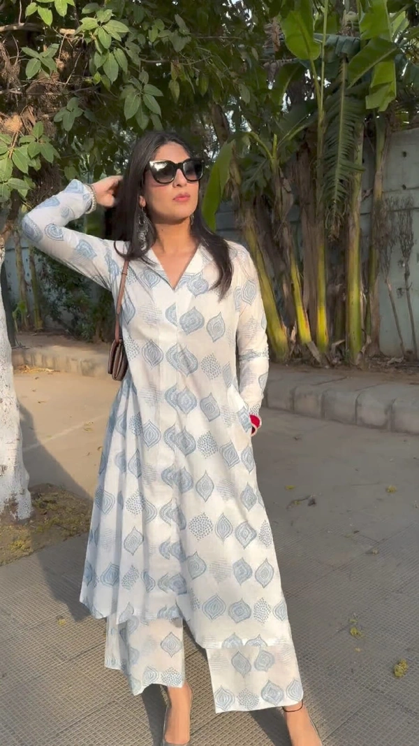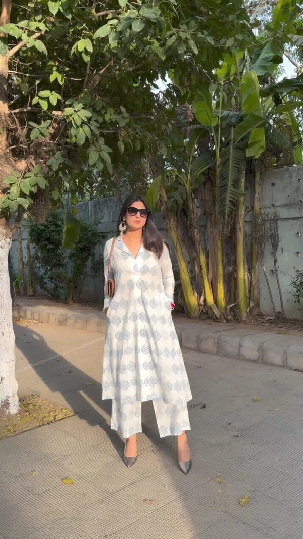 *Pure Cotton A line Kurti with Stylish Collar Pattern Fromat Open Style & Printed Cotton Pant*
