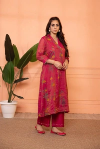 This 2-piece set features a high-collar kurta with pearl less detailing on the neck and beaded tassels in the front. It is paired with bottoms adorned with pearl and shell detailing.