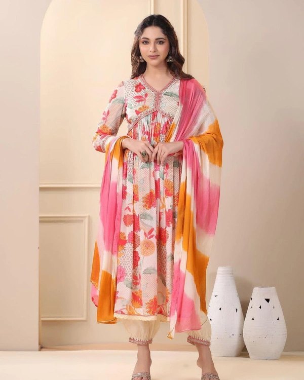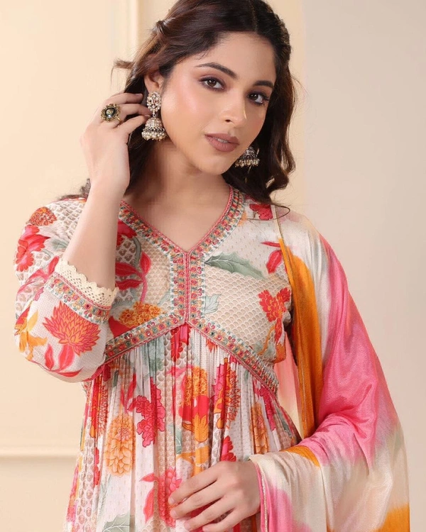 *Rayon mirror embroidery work on yoke & dupatta border*