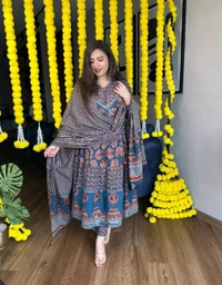 *Anarkali ensures you stand out with its intricate Ajrakh print and Flattering silhouette Embrace the spirit of the session in this trading festival wear that promise style comfort,and grace for every special moment*