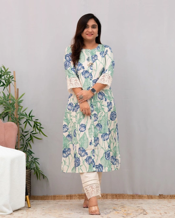 New in our Cotton summer casual pant set prefect for daily and office wear . *Aline kurta with lace detailing on sleeves* and beautiful matching lace detailed pant ..