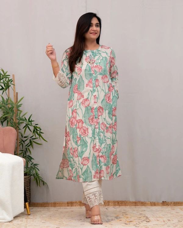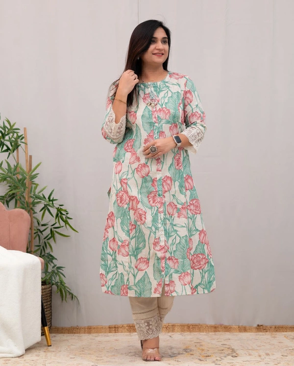 New in our Cotton summer casual pant set prefect for daily and office wear . *Aline kurta with lace detailing on sleeves* and beautiful matching lace detailed pant ..