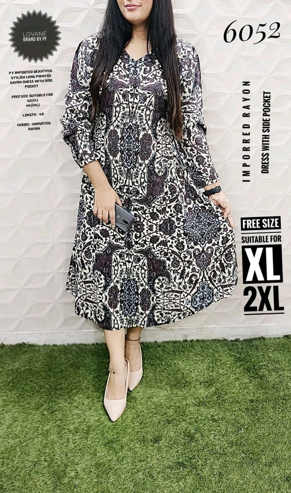6052 BEAUTIFUL STYLISH PRINTED LONG DRESS WITH SIDE POCKET RAYON COTTON MIX