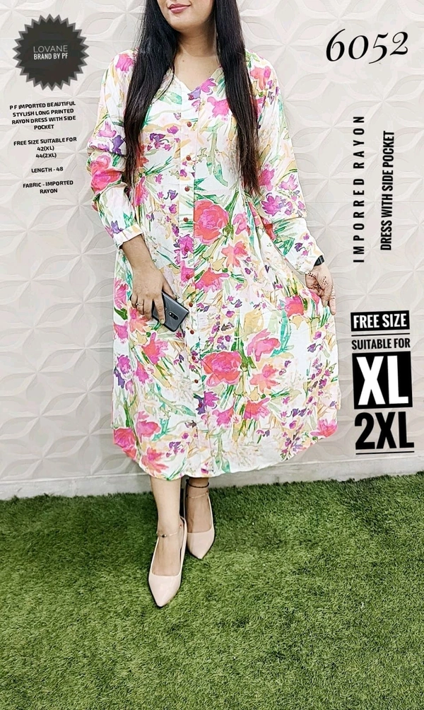 6052 BEAUTIFUL STYLISH PRINTED LONG DRESS WITH SIDE POCKET RAYON COTTON MIX