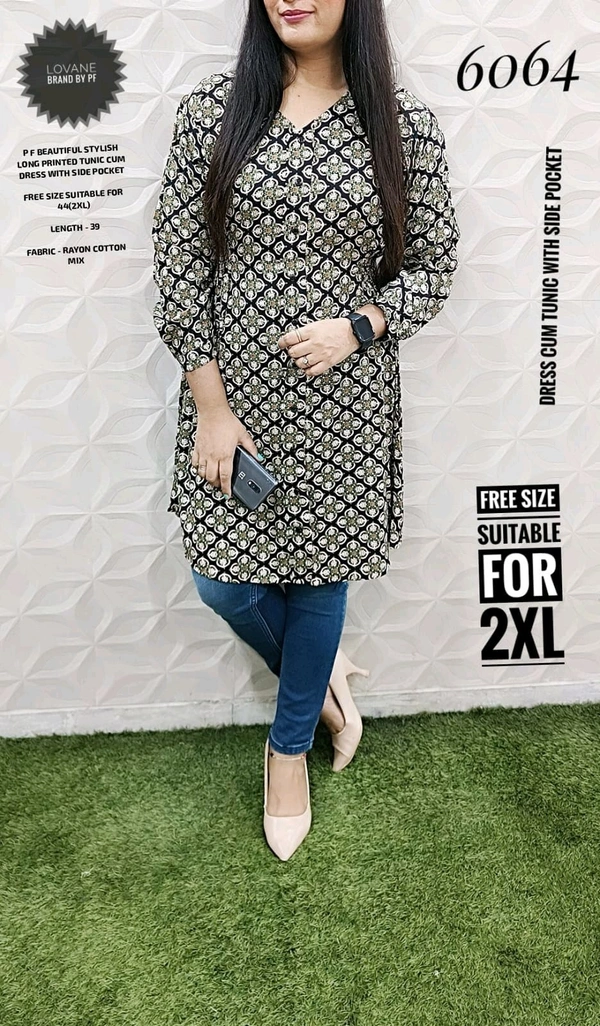 6064 STYLISH RAYON COTTON LONG PRINTED TUNIC CUM DRESS WITH SIDE POCKET