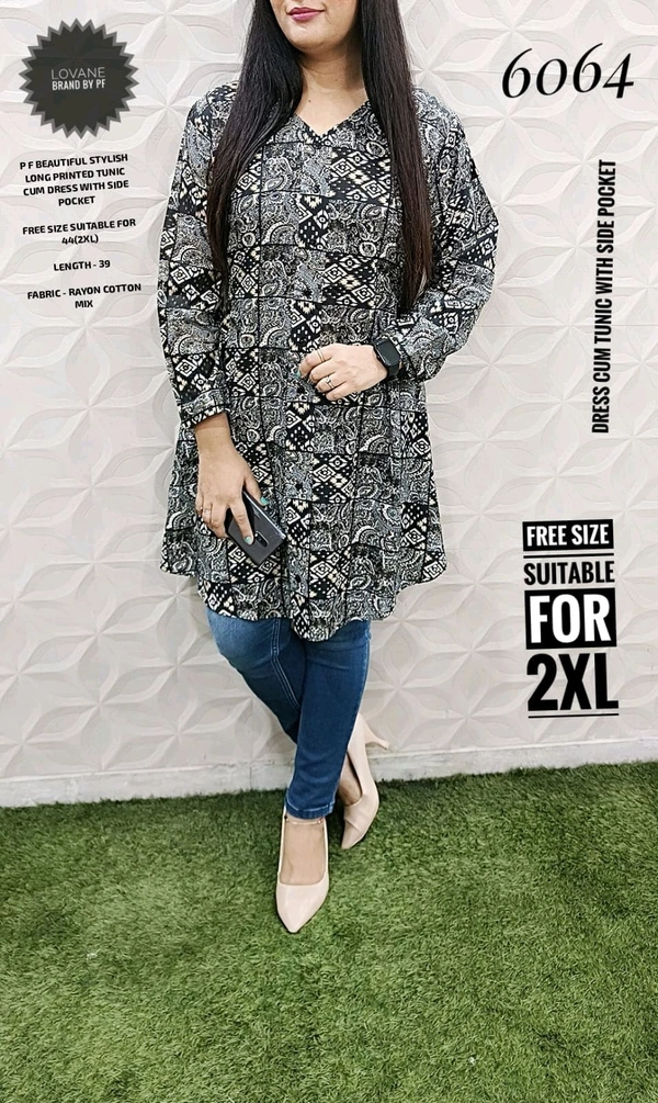 6064 STYLISH RAYON COTTON LONG PRINTED TUNIC CUM DRESS WITH SIDE POCKET
