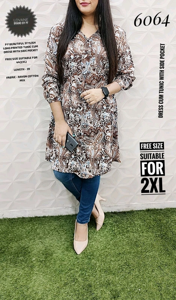 6064 STYLISH RAYON COTTON LONG PRINTED TUNIC CUM DRESS WITH SIDE POCKET