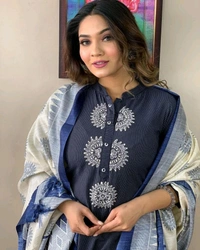 5417 Pure Cotton Kurta suit set embroidery work paired with flower kota silk dupatta and cotton pants