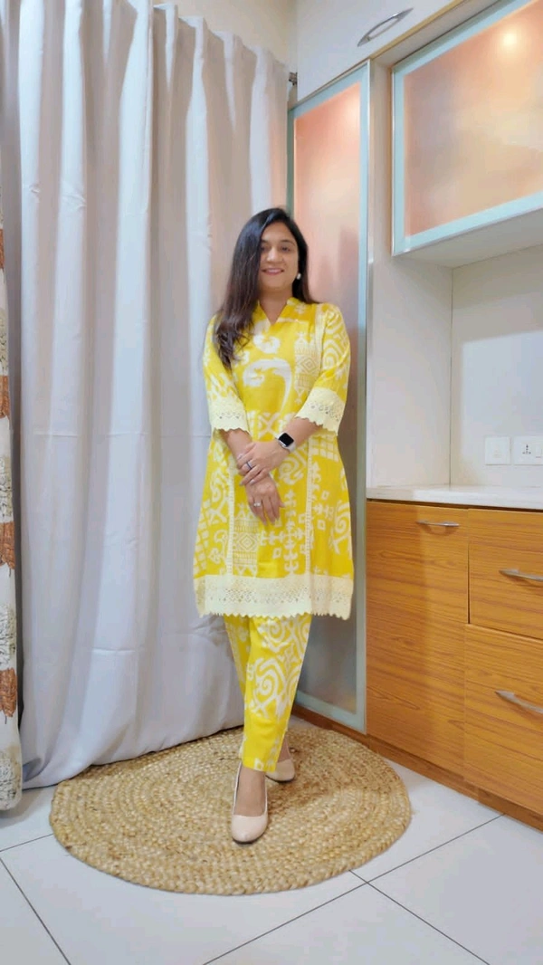 5467 Brighten your wardrobe with betel print Heavy cotton Co-ord setVibrant yellow & Lace Work