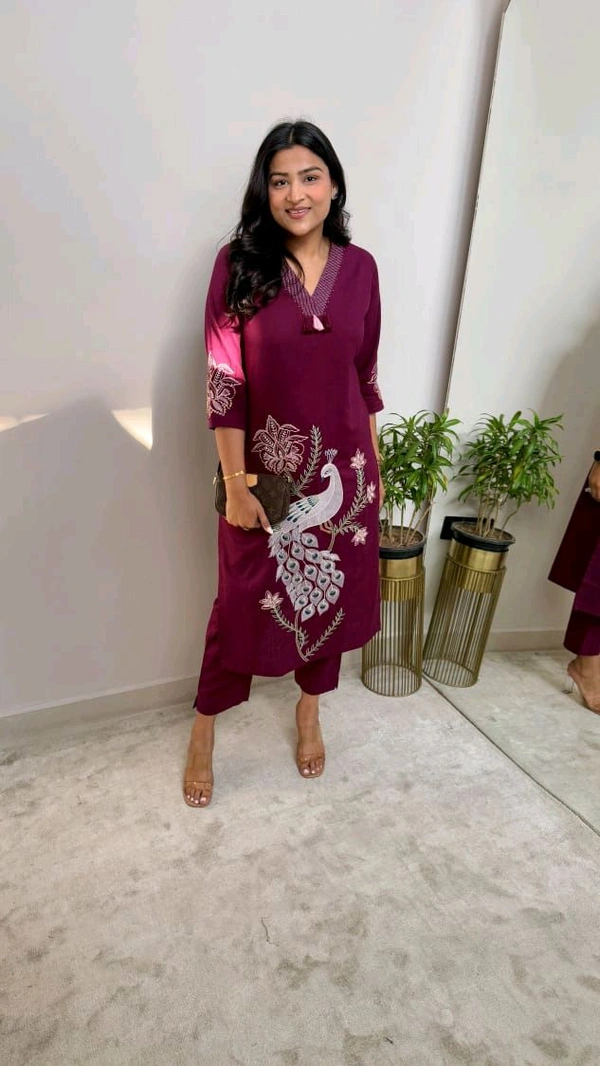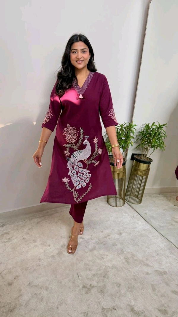 5622 Pure Linen Cotton Kurta Pants With Katha Work embroidery work*