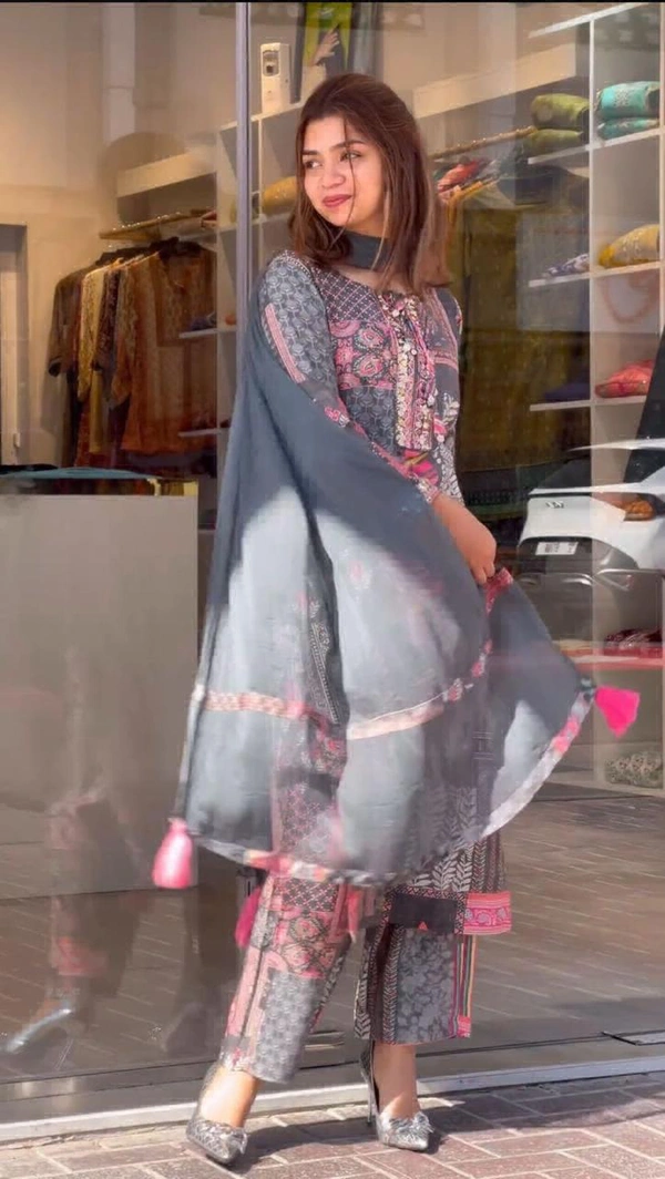 Featuring soothing yet georgette print and full lining with printed pent and Nazneen dupatta with embroidery work lace elegant printing A-line kurtis with 2 Color. Maltiprint and pettern. It is a perfect outfit for any small gathering or function. It is very comfortable as it looks